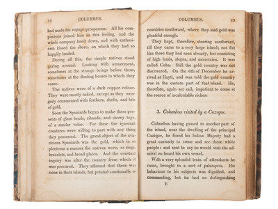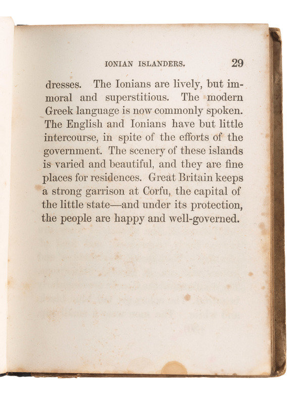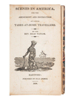 TAYLOR, Rev. Isaac. Scenes in America, for the Amusement and Instruction of Little Tarry-at-Home Travellers. Hartford: Silas Andrus, 1830. 16mo, leather spine replaced, folding map frontis, 117 pp.