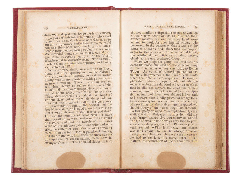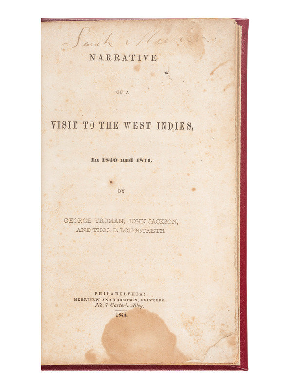 TRUMAN, George, Jackson, John and Longstreth, Thos. B. Narrative of a Visit to the West Indies, in 1840 and 1841. Philadelphia: Merrihew and Thompson, 1844. 12mo, rebound in red leather, gilt spine, 130pp.