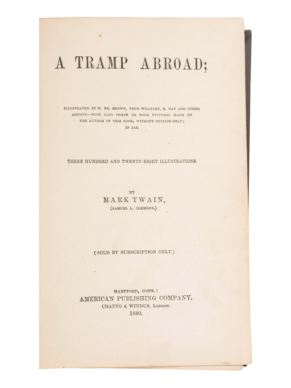 CLEMENS, Samuel (Mark Twain) (1835-1910). A Tramp Abroad. Hartford (CT): American Publishing Company, 1880. 8vo, brown cloth with gilt titles front and spine, 631pp. Double frontis (portrait and cartoon).
