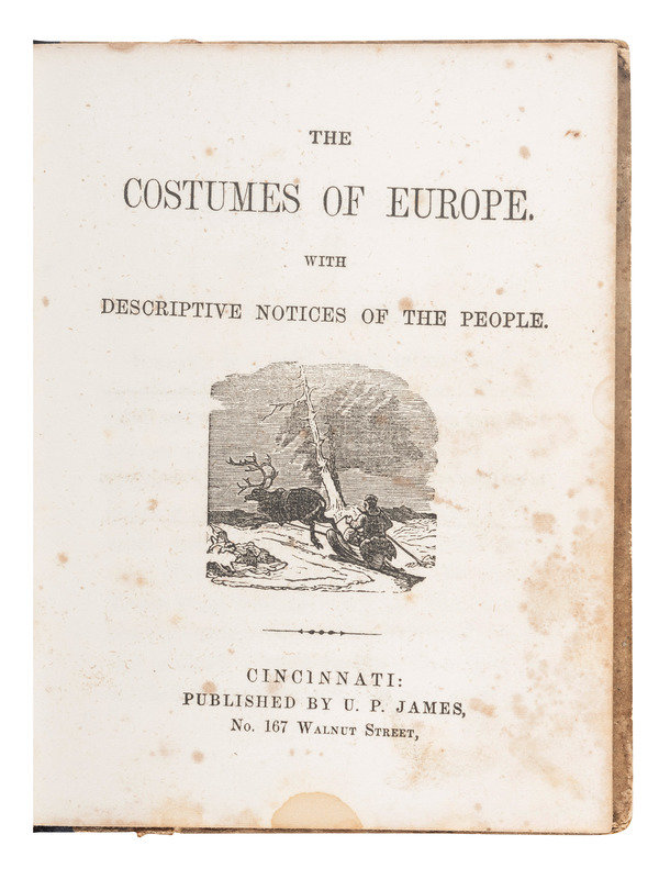 JAMES, J.A. & U.P. The Costumes of Europe, with Descriptive Notices of the People. Cincinnati: U.P. James, 1852. 24mo, printed paper boards, half leather, 128pp. (scattered browning)