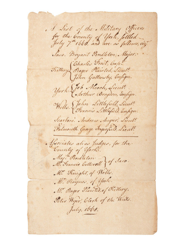 Titled "A List of the military Officers for the County of York, Settled July 7th 1668 and area as follows, viz." the document then lists ten officers from Saco, York, and Wells, as well as "Scarboro'" and Falmouth, both which are technically in neighboring Cumberland County. The list continues with "Associates alias Judges, for the County of York," listing 6 men from Saco, Wells, York, and Kittery.