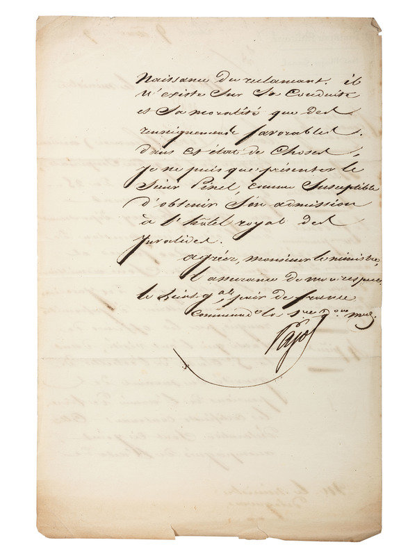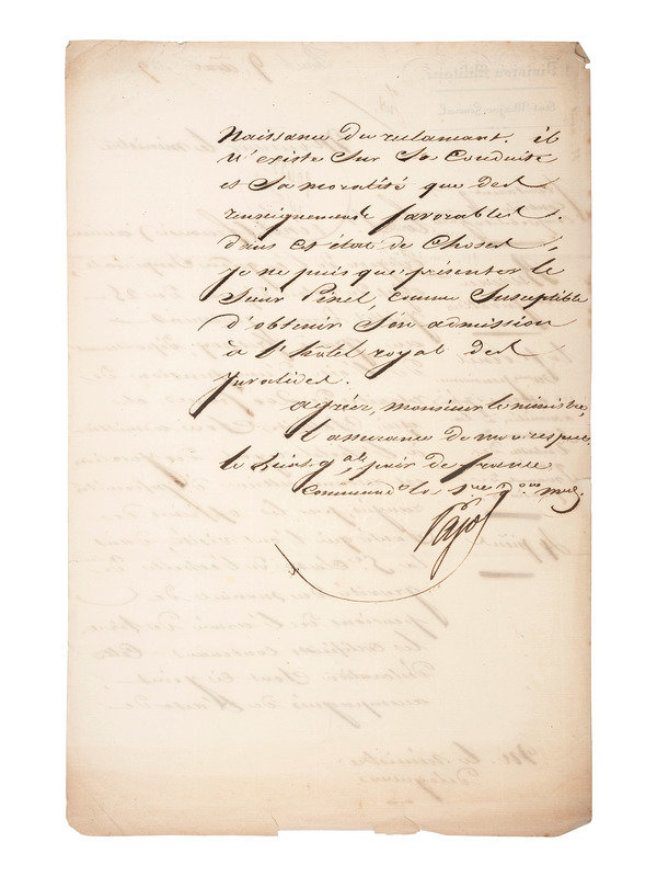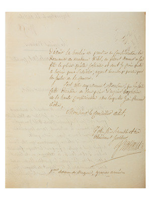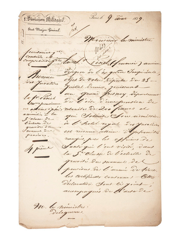 [With:] PAJOL, Claude-Pierre (1772-1844). Letter signed ("Pajol"), to Minister of War [Antoine Virgile Schneider?]. Paris, 9 August 1839. 2 pages, 4to, old creases, small chips at edges.