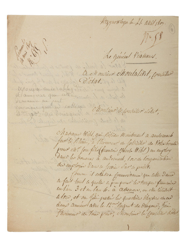 Viallanes was a military man, originally enlisting with the Regiment of Dragoons of Artois in 1780, which became the 12th Regiment of Dragoon sin 1791. During the French Revolution, his career accellerated and was promoted through the ranks. He was active in command during the French Revolution and the Napoleonic Wars. This letter to a woman regarding a military appointment for her son was written during the War of the Fourth Coalition (1806-1807) during the Polish campaign.