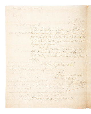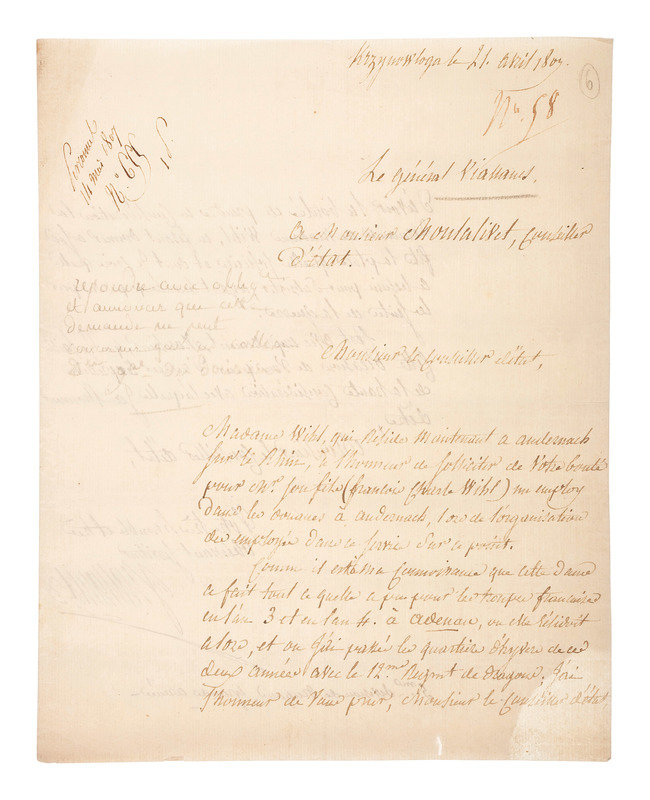 VIALLANES, Jean-Baptiste (1761-1826). Autoraph letter signed ("Viallanes"). Krzynowłoga, [Poland], 21 April 1807. 2 pages, 4to, loss to corner of integral leaf, pencil inscriptions.