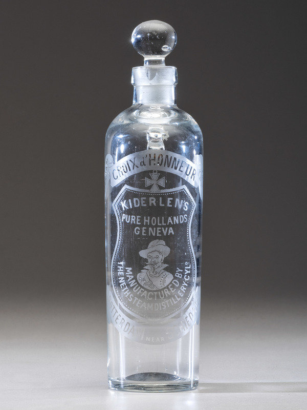 Etched gin bottle/decanter with stopper. “Amsterdam / Croix d’Honneur 1895,” “Kiderlens Pure Hollands Geneva,” image of a “musketeer,” “Manufactured by the Nethsteam Distillery. Cyld. / Rotterdam near Schiedam.” 10-1/4” tall with stopper; 9” tall with no stopper. Loop handle on back.