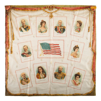 Two pillow covers, 19th century, with American allies in Europe. American flag in center (46 stars). With portraits of King George and Queen Olga of Greece; King Peter and Queen Elizabeth of Servia; King Victor Emanuel and Queen Helena of Italy; King Nicholas and Queen Milena of Montenegro; and King Ferdinand and Queen Elenore of Bulgaria. One has a backing stitched to it, the other is as it came off the bolt.
