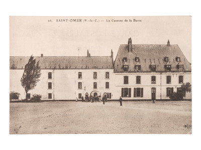 The Prince was serving on the staff of Sir John French, Commander-in-Chief of the British Expeditionary Force in France at the time he wrote this note. The postcard features a lithograph of the barracks at Saint-Omer in France.