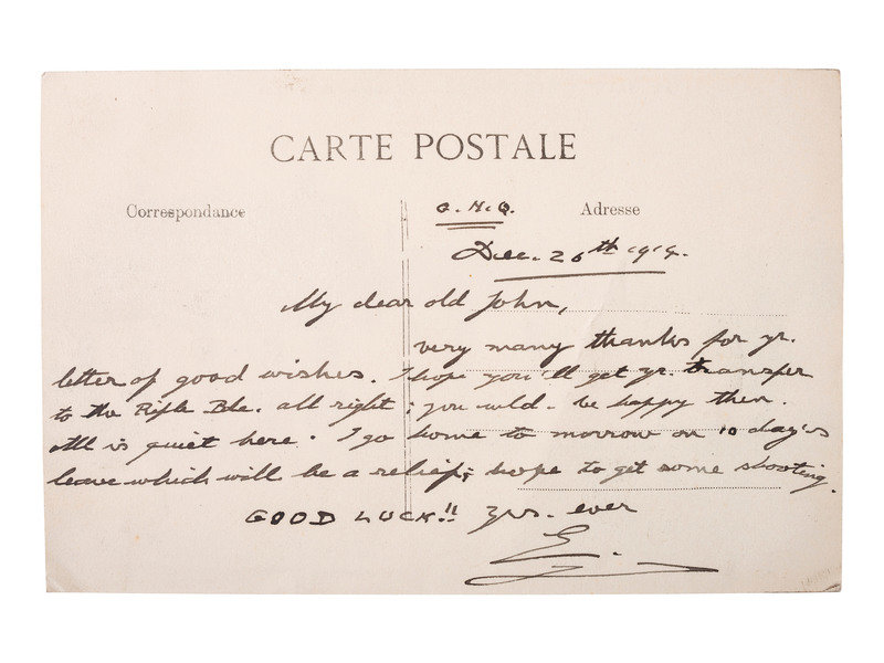 [ROYALTY]. WINDSOR, Edward, Duke of (1894-1972). Autograph postcard signed ("E"), as Prince of Wales, to "My dear old John." G.H.Q., 26 December 1914.