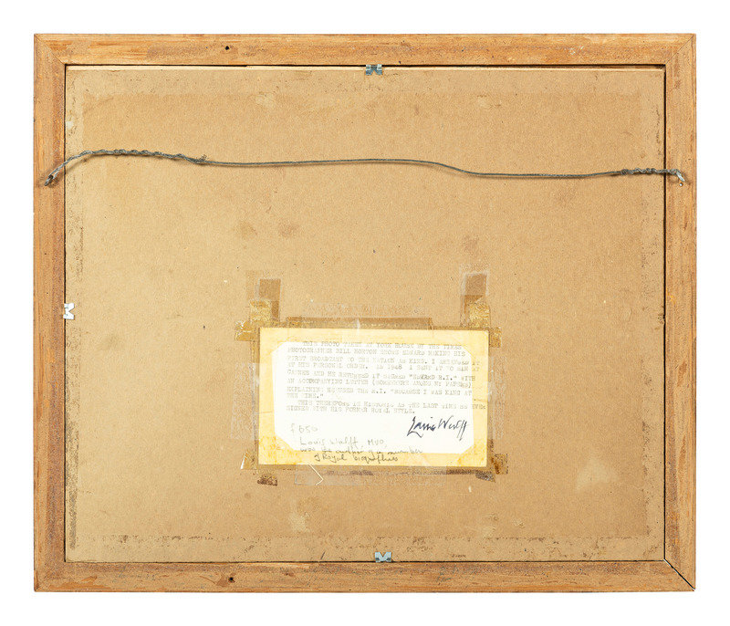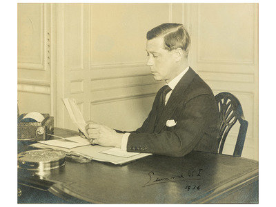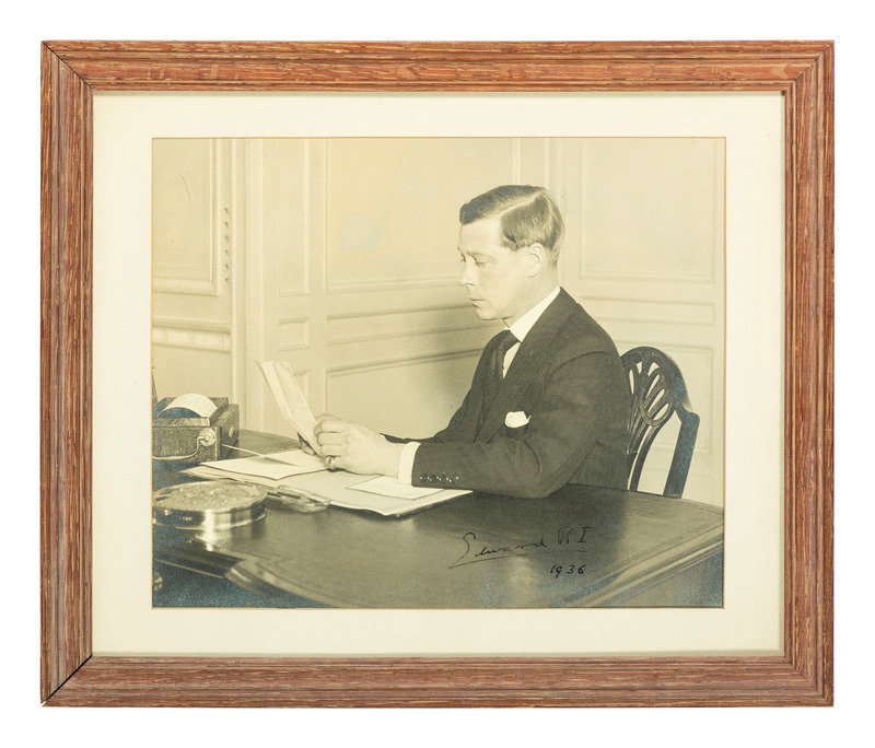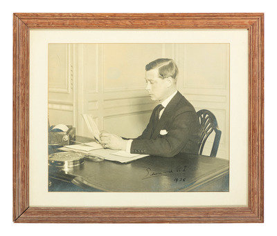 With typed note signed by royal biographer Louis Wulff affixed to back of frame, which reads: "This photo taken at York House by the Times photographer Bill Horton shows Edward making his first broadcast to the nation as king. I arranged it as his personal order. In 1948 I sent it to him at Cannes and returned it signed "Edward R.I." with an accompanying letter (somewhere among my papers) explaining he used the RI 'because I was king at the time.' This therefore is historic as the last time he ever signed with his former royal style." Note that the "accompanying letter" mentioned in Wulff's note is not included with the lot.