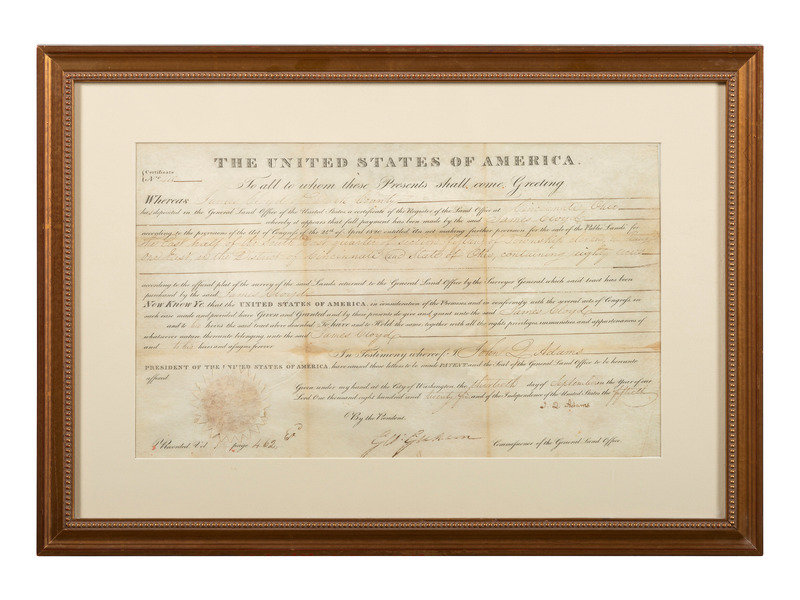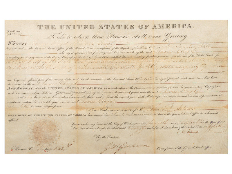 A land grant to James Cloyd (1790-1872) of Darke County, Ohio, registered in the Land Office at Cincinnati, Ohio. Cloyd, originally from Appalachia, was a veteran of the War of 1812, having served as a private in 2nd (Price's) Regiment of Ohio Militia. Census data notes that Cloyd was a farmer in German Township in Darke County, Ohio. The document is completed in a secretarial hand, and signed by President Quincy Adams.