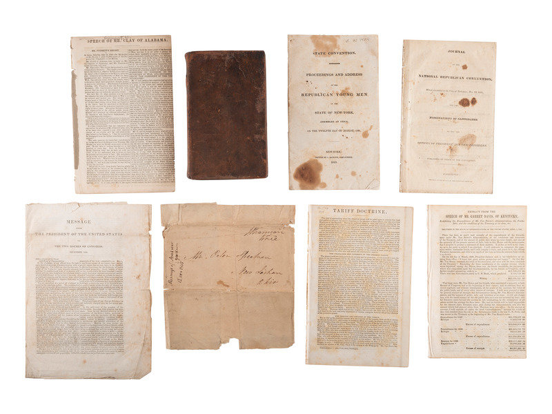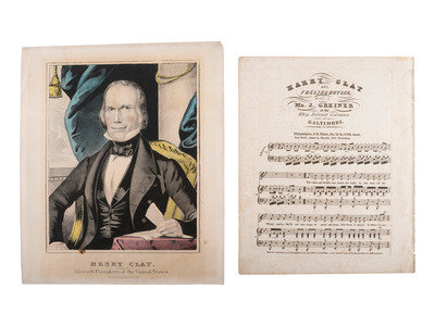[Also with:] A group of 9 political pamphlets, ca 1840s, documenting speeches, doctrines, and conventions. -- Sheet music, "Harry Clay and Frelinghuysen Written by Mr. J. Greiner at the Whig National Convention at Baltimore." Philadelphia and New York: G.E. Blake, 1844. -- Hand-colored 12 x 14 in. lithograph by N. Currier titled "Henry Clay. Nominated for Eleventh President of the United States," 1844.