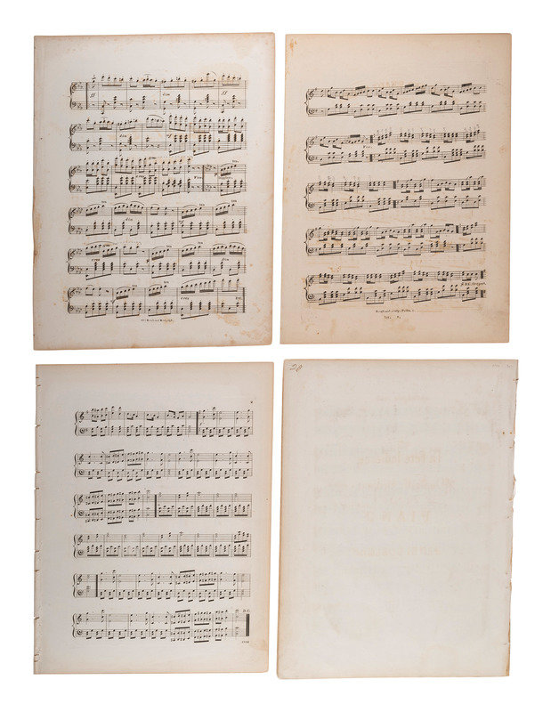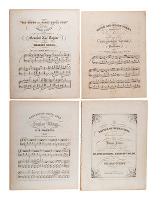 GROBE, Charles (ca 1817-1879). "Old Rough and Ready Quick Step." Philadelphia: George Willig, 1846. OCLC locates 7 copies. -- STRIBY, William (1815-1891). The Battle of Buena Vista. Louisville, KY and New York: H.J. Peters & Co. and Firth, Hall & Pond, [1847]. OCLC locates 9 copies. -- HASKELL, D.H. Convention Quick Step Dedicated to the Taylor Whigs. Boston: Oliver Diston, 1848. OCLC locates only 1 copy, at Brigham Young University. -- BELLAK, James (1813-1891). Rough and Ready Polka. Philadelphia and New York: Lee & Walker and E.R. Johnston, 1848. OCLC locates only 4 copies. -- Together, 4 pieces of sheet music, 4to, disbound, all in very good to fine condition, occasional spotting or toning.