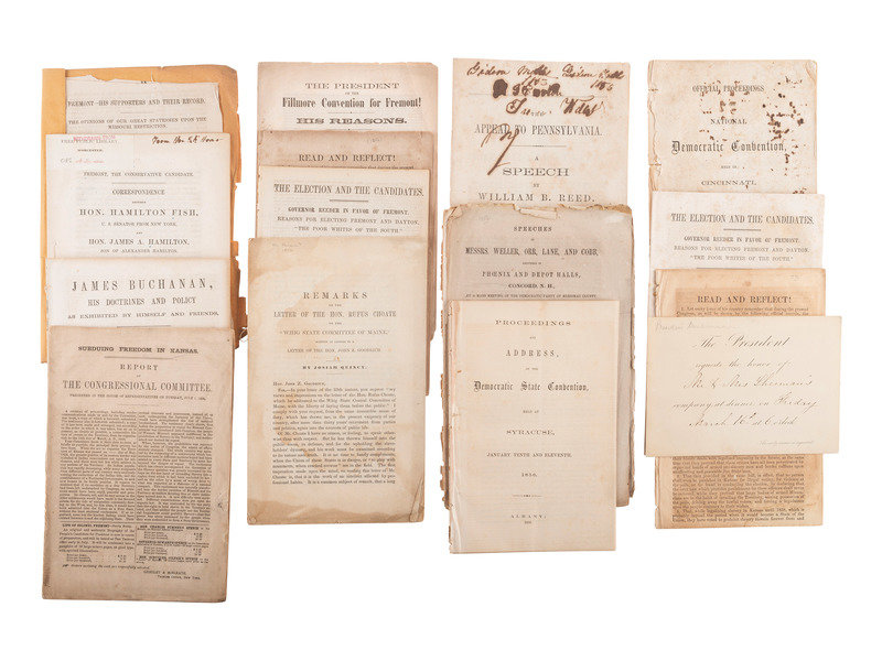 James Buchanan, His Doctrines and Policy as Exhibited by Himself and Friends. New York: Greeley & McElrath, 1856. -- FISH, Hamilton (1808-1893). Fremont, The Conservative Candidate. Correspondence Between Hon. Hamilton Fish, U.S. Senator from New York, and Hon. James A. Hamilton, Son of Alexander Hamilton. N.p.: N.p., [1856]. Provenance: Free Public Library, Worcester, [MA?] (cataloging slip, withdrawn stamp). Sabin 24431. -- Subduing Freedom in Kansas. Report of The Congressional Committee. New York: Greeley & McElrath, 1856. Sabin 68197. -- Fremont-His Supporters and Their Record. The Opinions of Our Great Statesmen Upon the Missouri Restriction. N.p.: N.p., n.d. -- Official Proceedings of the National Democratic Convention, Held in Cincinnati. July 2-6, 1856. Cincinnati: Enquirer Company Steam Printing Establishment, 1856. -- And 9 others. Together, 14 pamphlets from the 1856 election, 8vo, all FIRST EDITIONS, condition generally very good to fine, some creasing, toning.