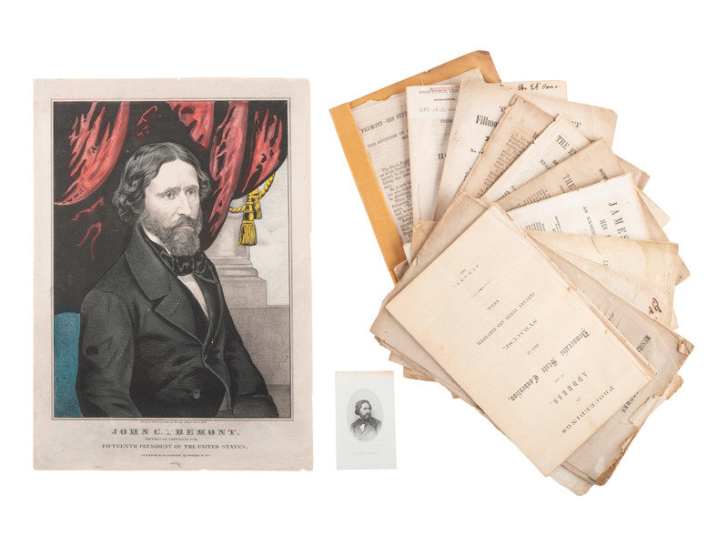 [With:] CURRIER, Nathaniel (1812-1888), publisher. John C. Fremont, Republican Candidate for Fifteenth President of the United States. Hand-colored lithograph, 1856, image 8 1/2 x 11 3/8 in. (10 x 14 in. sheet), on wove paper, light soiling, small chips at edges. -- WILLARD, A. J.C. Fremont. N.p., n.d. 2 1/8 x 3 1/2 in. engraved card (light discoloration at top edge).