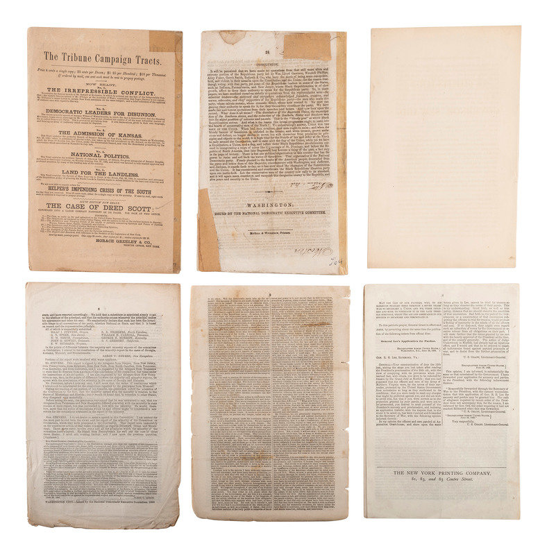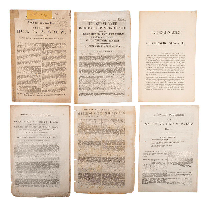 [With:] GREELEY, Horace (1811-1872). Mr. Greeley's Letter to Governor Seward. New York: N.p., 1860. Written after the nomination, a defense of his support for Lincoln and the dissolution of his partnership with Seward. RARE: OCLC locates only 2 copies. -- GROW, Galusha (1823-1907). Tribune Tracts No. 5. Land for the Landless Speech of Hon. G.A. Grow. New York: Horace Greeley & Co., 1860. Sabin 28995. GROW'S CUT SIGNATURE AFFIXED TO COVER. Grow was a Representative from Pennsylvania and the 24th Speaker of the United States House of Representatives. -- SEWARD, William H. (1801-1872). The State of the Country. Speech of William H. Seward in the United States Senate. N.p.: N.p., 1860. -- HALLETT, Benjamin F. (1797-1862). Breckinridge and Lane Campaign Document, No. 7, Speech of Hon. B.F. Hallett, of Mass. Washington, D.C.: National Democratic Executive Committee 1860. -- The Great Issue to Be Decided in November Next! Shall the Constitution and the Union Stand or Fall, Shall Sectionalism Triumph? Lincoln and His Supporters. Washington, D.C.: National Democratic Executive Committee, McGill & Witherow, [1860].