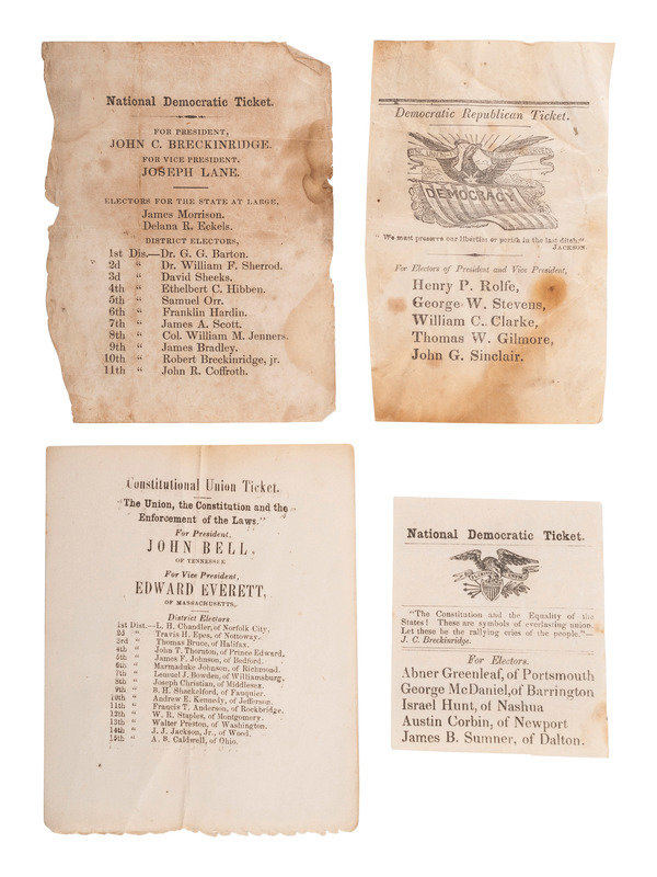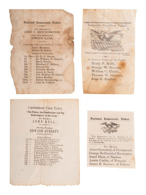 National Democratic Ticket. For President, John C. Breckinridge. For Vice President Joseph Lane. [Indiana?]: N.p., [1860]. 3 5/8 x 4 3/4 in. (Toned with some dampstaining). -- National Democratic Ticket. [New Hampshire]: N.p., [1860]. 2 9/16 x 3 1/16 in. With a patriotic vignette, a quote from Breckinridge, and the list of New Hampshire electors for the Breckinridge and Lane ticket. -- Constitutional Union Ticket. "The Union, the Constitution and the Enforcement of the Laws." For President, John Bell, of Tennessee For Vice President, Edward Everett, of Massachusetts. [Virginia]: N.p., [1860]. 3 13/16 x 4 3/4 in. -- Democratic Republican Ticket. [New Hampshire]: N.p., [1860]. 2 7/8 x 4 3/4 in. With a patriotic vignette listing the New Hampshire electors for the Douglas and Johnson ticket. -- Together, 4 ballots from the 1860 election, condition generally very good to fine, except where noted.