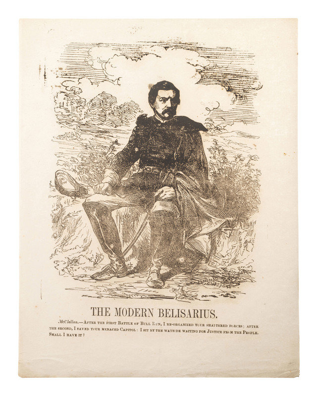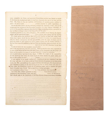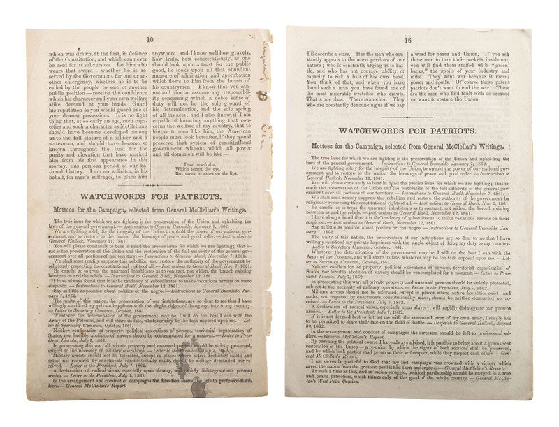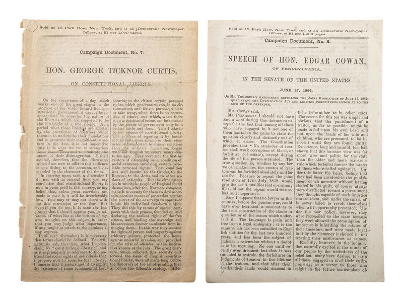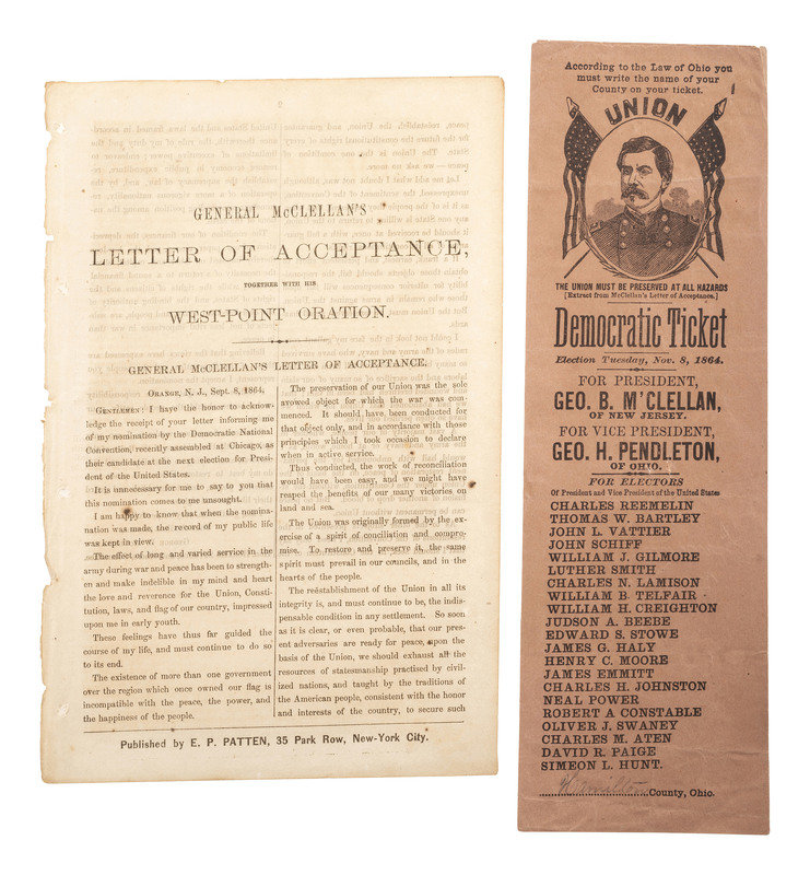 Union Democratic Ticket. Hamilton County, Ohio: N.p., [1864]. 3 1/8 x 9 7/8 in. Democratic ticket featuring portrait of McClellan in uniform, flanked by flags. -- The Modern Belisarius. N.p, n.d. 8 1/2 x 10 7/8 in. engraving (uneven inking). Caption reads: "After the First Battle of Bull Run, I Re-organized your shattered forces; after the second, I saved your menaced Capitol: I sit by the wayside waiting for Justice from the People. Shall I have it?" -- General McClellan's Letter of Acceptance, Together with His West-Point Oration. New York: E.P. Patten, 1864. RARE: No copies have sold at auction since 1929. Sabin 43021. -- Campaign Document, No. 7. Hon. George Ticknor Curtis, on Constitutional Liberty. [New York]: N.p., [1862]. A pro-McClellan pamphlet. Sabin 18037. -- Campaign Document, No. 8. Speech of Hon. Edgar Cowan, of Pennsylvania. [New York]: N.p., [1864]. -- Together, 5 pieces of printed ephemera and pamphlets related to McClellan's presidential campaign.