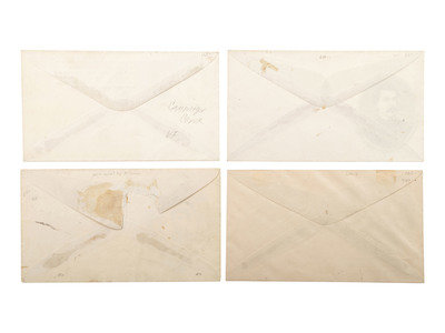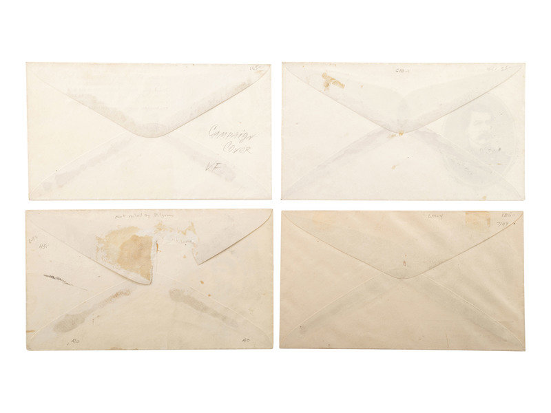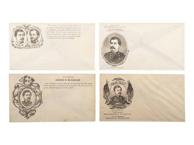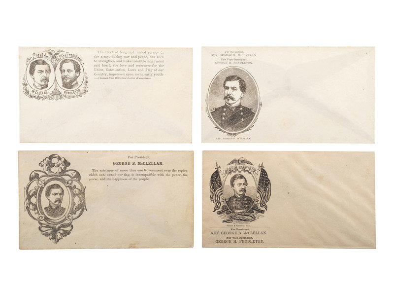For President, George B. McClellan. With portrait of McClellan with foliate frame and quote. (loss to flap). -- For President, Gen. George B. McClellan. For Vice-President, George H. Pendleton. Cincinnati, OH: Gates & Gamble, ca 1864. With portrait of McClellan flanked by cannons, flags, a crown of laurels, and a riband reading "Democracy For Ever." -- For President. M'Clellan. For vice President, Pendleton. With jugate portrait and quote from McClellan's Letter of Acceptance. -- Together, 4 covers from the 1864 Presidential campaign.