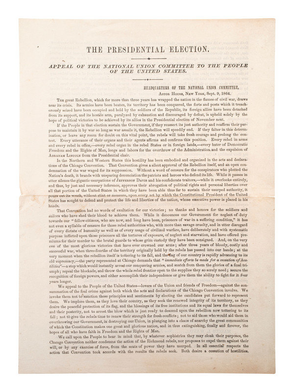 [CIVIL WAR -- 1864 PRESIDENTIAL ELECTION]. The Presidential Election. Appeal of the National Union Committee to the People of the United States. New York: National Union Committee, 1864.