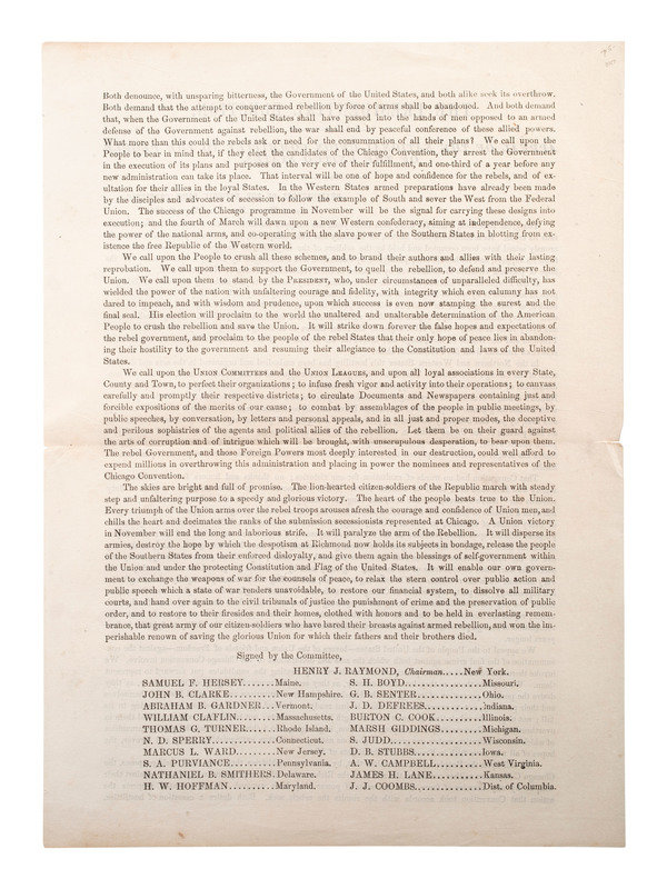 8 1/8 x 11 1/4 in. broadsheet (short separations at old crease). Signed in type by Henry J. Raymond, and 20 others representing the Union states (including Missouri, Kansas, and West Virginia) and Washington, D.C.