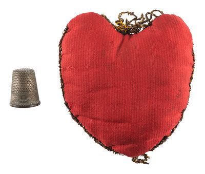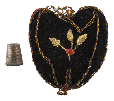Silver thimble that purportedly belonged to Mary Todd Lincoln, 1 in. height (oxidization, wear). -- Heart-shaped pin cushion constructed of black velvet front and red silk on verso, gold thread adornments along perimeter and surrounding embroidered green leaves and red berries, 3.5 in. x 4 in. (some minor stains on back of pincushion, wear and loose threads particularly to the detailed work on the pincushion).