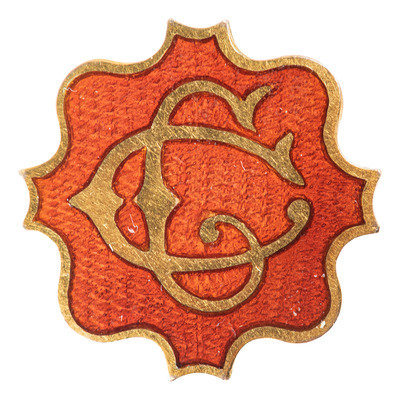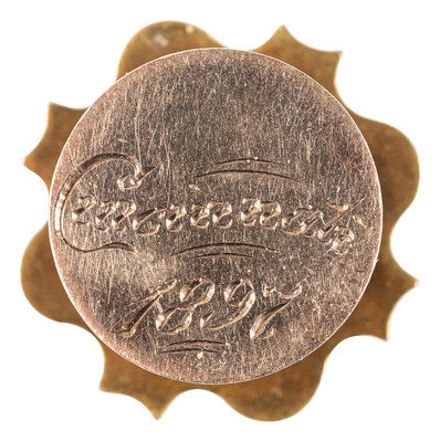 [With:] Late 19th-century Cincinnati collar button in 14K yellow gold with a gold scalloped edge and gilouche enameling work with a "C" over a "C". Engraved on verso, Cincinnati 1897. Measures .625 inch in diameter, weight, 1.2 dwt.