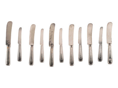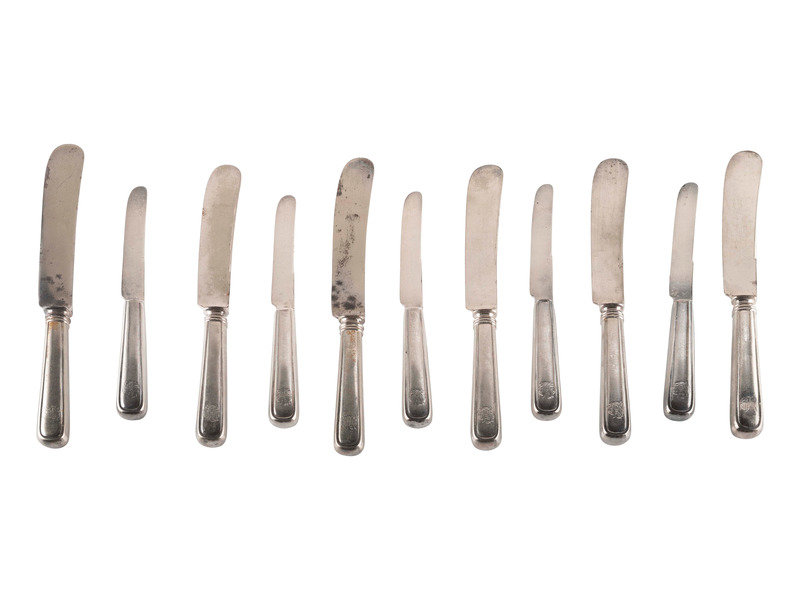 [With:] Harlan Lincoln group of 11 dinner knives monogrammed "MHL," marked "S," most likely silverplate, 2 measure 9 1/2 in., 4 measure 9 in., 5 measure 7 1/2 in. (scattered surface wear to knives).