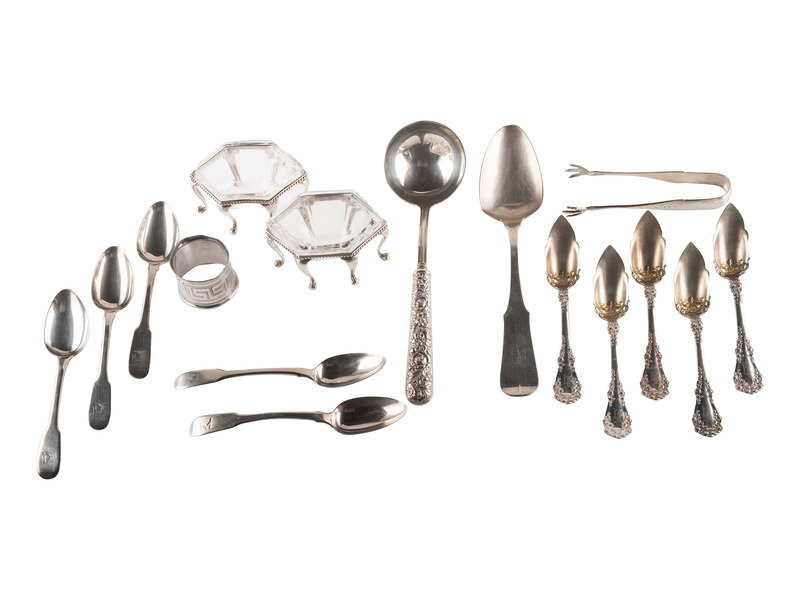 16 pieces, some monogrammed, including the following: 5 silverplate grapefruit spoons monogrammed "L," marked "1847 Rogers Bros.," active in Hartford, CT, 6 in. -- Napkin ring monogrammed "L," ht. 1 1/4 in., dia. 2 in. (wear to top and bottom rims) -- 5 silver spoons with unique engraving on tip of handle. -- 2 serving spoons, one monogrammed "AHR," marked "L.W. Clark?," 9 in., and 1 with handle marked Sterling, 9 in. -- Tongs marked Sterling. -- 2 salts, with bases marked Sterling and glass bowls (each with chipped edges), ht. 1 3/4 in., lg. 3 1/4 in.