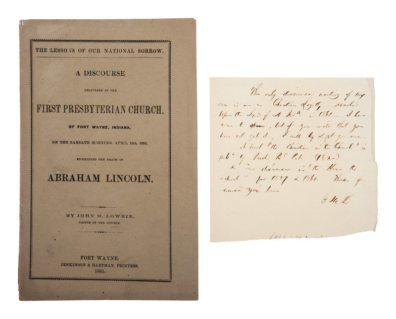 [LINCOLN, Abraham (1809-1865)]. LOWRIE, John M. (1817-1867). The Lessons of Our National Sorrow. Fort Wayne, IN: Jenkinson & Hartman, 1865.