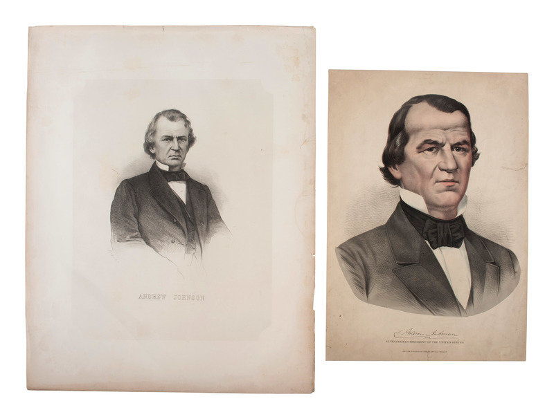 [Also with:] CURRIER & IVES, publishers. Andrew Johnson. Seventeenth President of the United States. Hand-colored lithograph, n.d., sheet 13 1/8 x 19 in. -- Andrew Johnson. Engraving, n.d. plate 13 x 17 in. (19 x 24 1/8 in. sheet). -- Together, 2 prints of Johnson, short marginal tears, some soiling, light dampstains.