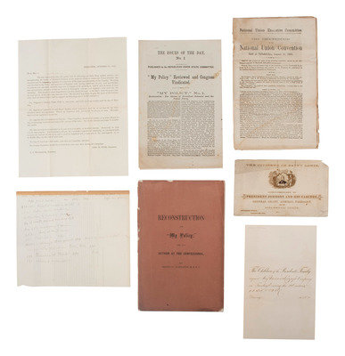 The Issues of the Day. No. 1. "My Policy" Reviewed and Congress Vindicated. [Washington?]: Republican Union State Committee, [1866]. RARE: OCLC locates only 3 copies. -- National Union Executive Committee. The Proceedings of the National Union Convention Held at Philadelphia. N.p.: N.p., 1866. -- Comitatus, Zedekiah, pseudonym. Reconstruction on "My Policy;" Or, Its Author at the Confessional. Skaggaddahunk: Scantlewood, Timberlake & Co., Printers to the "North River Society," 1866. (Front wrapper detached.) Sabin 14952. -- EDMUNDS, George F. (1828-1919). Impeachment of the President. Opinion of Mr. Edmunds, of Vermont. N.p.: N.p., 1868. RARE: OCLC locates 4 copies. -- Raising Money to Be Used in Impeachment. [Washington?]: N.p., 1868. 40th Congress, 2nd Session, House of Representatives, Report No. 75. RARE: OCLC locates 8 copies. -- And 4 others. Together, 9 pamphlets, 8vo, all FIRST EDITIONS, condition generally very good to fine, except where noted.