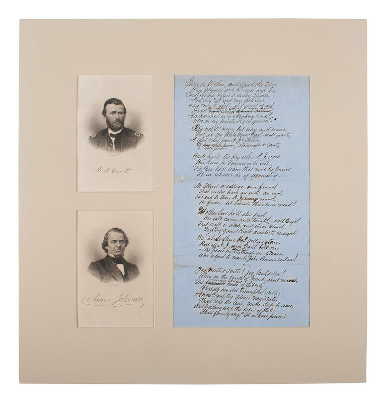 [With:] The Citizens of Saint Louis, Complimentary to President Johnson and His Cabinet, General Grant, Admiral Farragut, and the Diplomatic Corps. Saint Louis: N.p., 1866. 6 1/2 x 4 in. printed ticket with albumen photograph of Johnson (chips and short tears at edges, soiling). -- Invitation from "The Children of the President's Family." 5 x 8 in. engraved invitation. -- Johnson Union Club.typed circular. Herkimer, [NY], 10 October 1866. Signed in type by George W. Pine and C.C. Withersitne. 1 page, 4to, old creases. -- Manuscript poem in verse. 7 7/8 x 14 3/4 in. Matted with bookplate engravings of Grant and Johnson by H.W. Smith. -- Together, 4 items of printed and manuscript ephemera.