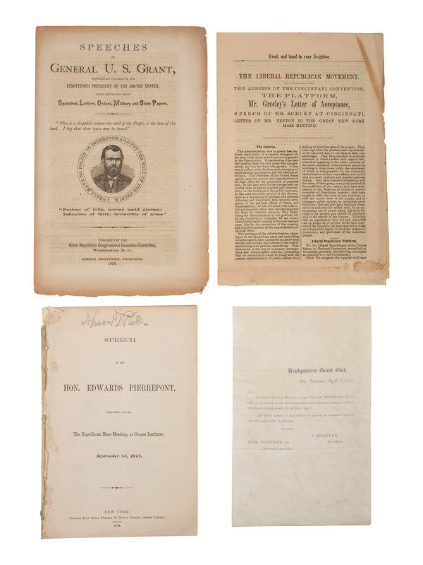 [Also with:] "Speech of the Hon. Edwards Pierrepont, Delivered Before The Republican Mass Meeting, at Cooper Institute, September 25, 1872." New York: Evening Post Steam Presses, 1872. 23pp, 5 3/8 x 8 in. (disbound). -- "Speeches of General U.S. Grant, Republican Candidate for Eighteenth President of the United States, Being Extracts from Speeches, Letters, Orders, Military and State Papers." Washington, D.C.: Union Republican Congressional Executive Committee, Gibson Brothers, Printers, 1868. 16pp, 6 1/8 x 9 5/8 in. (toning, chipping to page edges). -- "The Liberal Republican Movement. The Address of the Cincinnati Convention, the Platform, Mr. Greeley's Letter of Acceptance, Speech of Mr. Schurz at Cincinnati, Letter of Mr. Fenton to the Great New York Mass Meeting." 7pp, 6 x 9 1/4 in. (dampstains, chipping to page edges). N.p., [1872]. -- Together, 3 pamphlets.