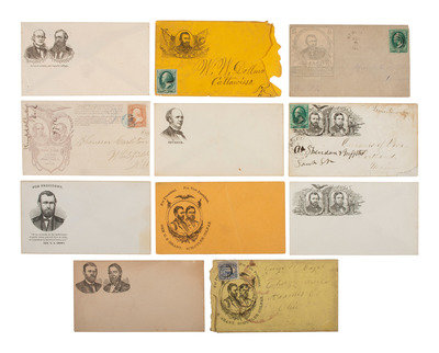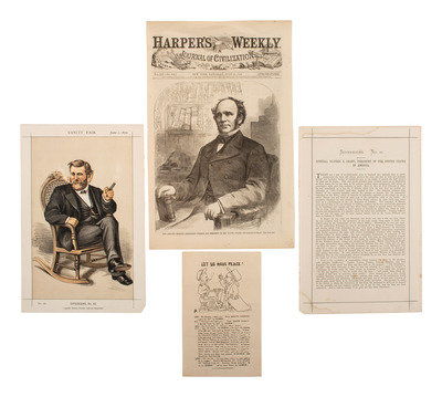 [With:] Republican ticket featuring portraits of Ulysses S. Grant and Henry Wilson along with the names of nominees for presidential electors. 4 1/4 x 8 in. printed ticket (discoloration, wear to edges). -- Advertising cartoon from Puck depicting caricatures of Ulysses S. Grant, Rutherford B. Hayes, and Benjamin Butler enjoying Capadura cigars. 5 3/8 x 3 1/4 in. printed cartoon with advertisement for Brooklyn's "'Old Times' Segar Store No. 2" on reverse. -- Tobacco label for Genuine Durham Tobacco, featuring portrait of Samuel J. Tilden when bottom portion is folded up and a portrait of Ulysses S. Grant when bottom portion is unfolded. Text above and below portrait beckons "True Born Democrats" to "Gaze On" the face of Tilden, and "All You Good Republicans" to "behold the visage" of Grant. New York: Donaldson Brothers, ca 1870s. 3 3/8 x 5 3/4 in. printed label (creased, with light soiling and wear to edges). -- 14 illustrated covers featuring likenesses of Ulysses S. Grant, Horace Greeley, Schuyler Colfax, Horatio Seymour, and Frank P. Blair, 6 of which are postally used. -- And 11 other printed items including Vanity Fair and Harper's Weekly illustrations, printed invitations, advertisements, and more. -- Together, 28 printed materials relating to candidates and campaigns from the 1868 and 1872 presidential elections.