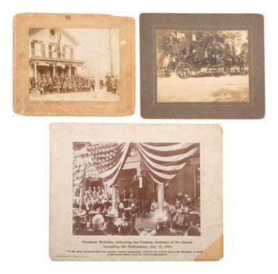 [With:] President McKinley delivering the Famous Sentence of his Speech Accepting the Nomination, July 12, 1900. Canton, OH: Fred W. Meyer, 1900. 6 1/2 x 4 3/4 in. photograph on cardstock mount (scuffs, surface scratches; mount soiled with partial loss to lower corner). Mount with printed title, caption, and photographer's imprint.