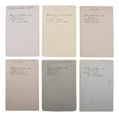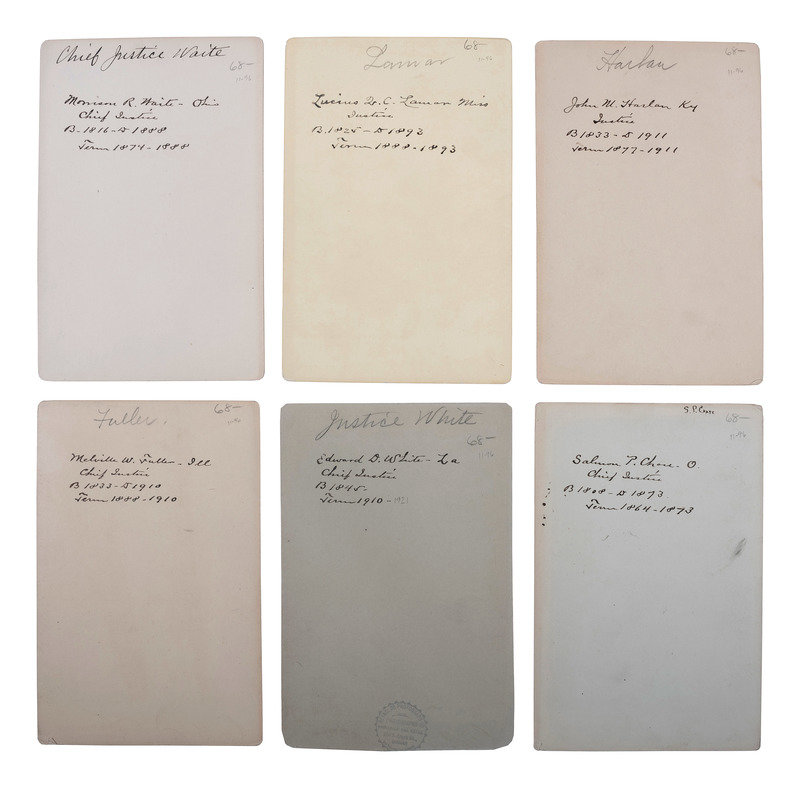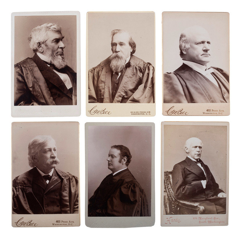 BELL, C.M., photographer. Cabinet cards featuring Supreme Court Justices John Marshall Harlan (Associate Justice, 1877-1911), Morrison Waite (Chief Justice, 1874-1888), Lucius Quintus Cincinnatus Lamar (Associate Justice, 1888-1893), Melvill Fuller (Chief Justice, 1888-1910), and Edward Douglass White (Chief Justice, 1910-1921). Washington, DC: Bell, n.d. Each with Bell's imprint on mount recto and ink inscription on verso identifying subject, state of origin, birth dates, death dates (in some instances), role on the Supreme Court, and term dates. -- HANDY, L.C., photographer. Cabinet card of Chief Justice Salmon P. Chase, 1864-1873. Washington, D.C.: Handy, n.d. Handy's imprint on mount recto. Ink inscription identifying Chase along with his birth, death, and term dates. -- Together, 6 cabinet cards featuring Supreme Court justices. Conditions generally fine, with some toning and wear to edges and corners.