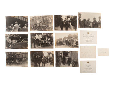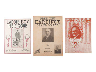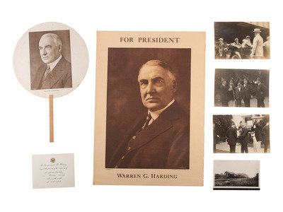 12 unmounted silver gelatin photographs capturing moments from Warren G. Harding's campaign for president. Each approx. 6 1/2 x 4 3/8 in. Conditions generally fine, most with some degree of toning. -- 6 pieces of printed White House stationery including Mrs. Harding's calling card and an invitation to meet President and Mrs. Harding. -- Warren G. Harding cardboard campaign fan featuring a halftone image of Harding on one side and "Harding for President / America First" on the other. Chicago, IL: Geraghty & Co., ca 1920. 14 1/8 in. lg. including wooden handle (surface soiling, some wear along fan edge). -- And 6 other items including 4 sets of sheet music, a poster of Harding, and a postcard featuring the train that carried the body of President Harding after his death. -- Together, 25 items related to President Warren G. Harding and his campaign for the presidency.