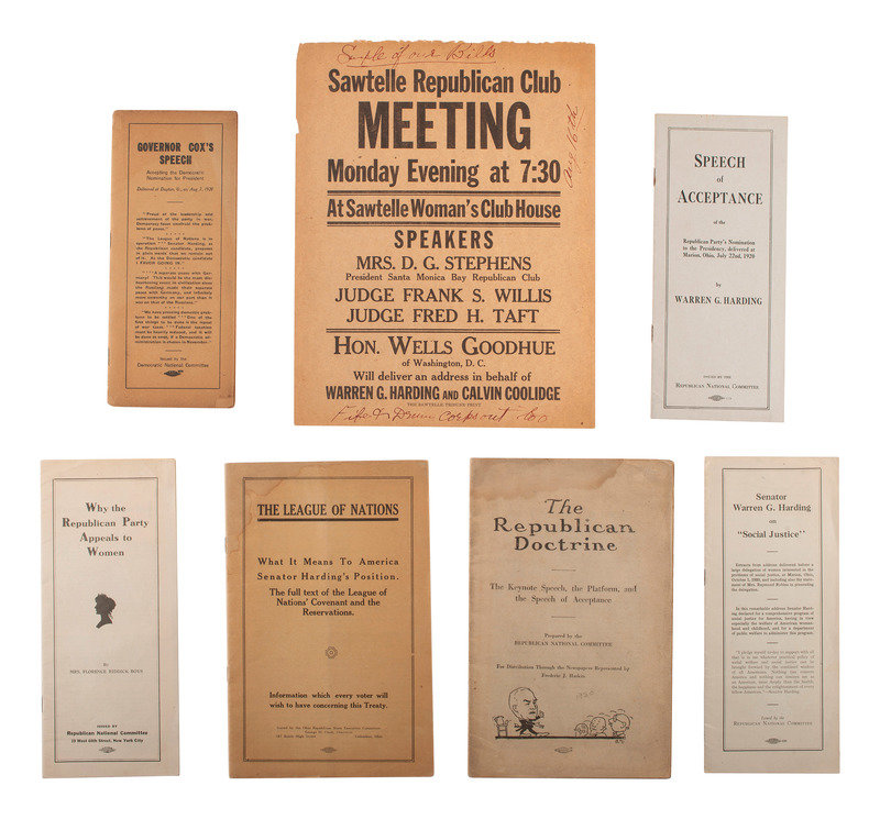 [With:] The League of Nations: What it Means to America Senator Harding's Position. Columbus, OH: Ohio Republican State Executive Committee, 1920. RARE: OCLC locates only 1 copy, held at the Ohio Historical Society. -- The Republican Doctrine: The Keynote Speech, the Platform, and the Speech of Acceptance. [New York]: [Allied Printing], [1920?]. RARE: OCLC locates only 2 copies. -- HARDING, Warren G. Speech of Acceptance of the Republican Party's nomination to the Presidency, delivered at Marion, Ohio, July 22nd, 1920. Chicago: Allied Printing, [1920]. OCLC locates 6 copies. -- HARDING, Warren G. Senator Warren G. Harding on "Social Justice." N.p.: Republican National Committee, [1920]. RARE: OCLC locates only 2 copies. -- BOYS, Florence Riddick. Why the Republican Party Appeals to Women. New York: Republican National Committee, [1920]. RARE: OCLC locates only 4 copies. -- COX, James (1870-1957). Governor Cox's Speech Accepting the Democratic Nomination for President. [New York?]: Democratic National Committee, 1920. RARE: OCLC locates only 4 copies. -- Together, 6 pamphlets.
