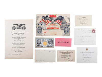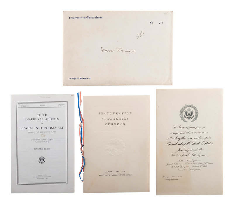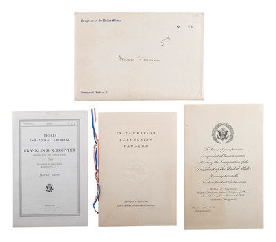 [Also with:] Inauguration Ceremonies Program. Washington, D.C.: Government Printing Office, 1937. 8vo. Original embossed wrappers ribbon bound. With original envelope. -- Photogravure portraits of Roosevelt and Garner. [Washington, D.C.]: Harris & Ewing, [1937]. Each image 3 3/16 x 4 1/2 in., sheet 6 1/8 x 9 7/8 in. With engraved portfolio. With facsimile signatures. -- Inaugural Souvenir Editions Jan. 20, 1937 Washington Herald. [Washington, D.C.]: [Washington Herald], [1937]. 8 3/8 x 5 1/2 in. order form printed in red and dark blue (minor toning, some offsetting). With portraits of FDR and John Nance Garner. -- Democratic Victory Dinner invitation. Washington, D.C.: Young Democratic Clubs of the District of Columbia, 1937. 7 x 9 1/2 in. --Third Inaugural Address of Franklin D. Roosevelt. Washington, D.C.: Government Printing Office, 1941. 8vo. Original wrappers (small hole to front wrapper). -- Together, 8 items of printed ephemera.