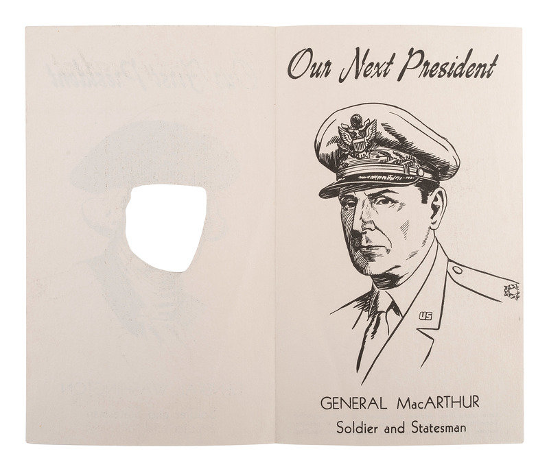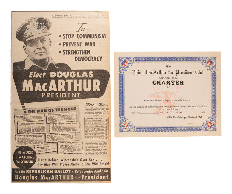 Paid advertisement by the Wisconsin Douglas MacArthur for President Club run in the Appleton Post-Crescent encouraging Wisconsin voters to vote for MacArthur-pledged delegates on the Republican ticket in the 1944 Wisconsin primary. -- Political campaign sticker "Republicans draft General MacArthur for President," ca 1944. -- Handbill enjoining "Fellow Americans!" to join the publisher in asking for a "Republican Reformed Ticket / Bring MacArthur Back as the Next President of these United States." N.d., n.p. -- A blank certificate from the "Ohio MacArthur for President Club" which granted charters to organizations promoting a MacArthur presidency, 1944. -- Metamorphic pamphlet featuring a front image of George Washington "Our First President / General Washington / Soldier and Statesman" with cut-out face opening to reveal the likeness of "Our Next President / General MacArthur / Soldier and Statesman." Published by the Draft MacArthur Committee, ca 1952. -- "Blueprint for Survival: Complete Text of General MacArthur's Speech on Constitutional Government Delivered before the Joint Session of Mississippi Legislature Jackson, Miss., March 22, 1952." Demand MacArthur Committee, ca 1952. -- Assorted stamps advocating MacArthur for president.