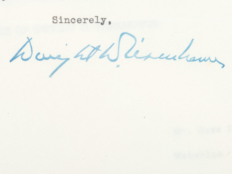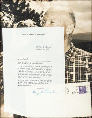 1 page, 4to, 7 x 10 1/4 in, on Office of Dwight D. Eisenhower letterhead, old creases, framed with original envelope and a photographic print of Eisenhower.