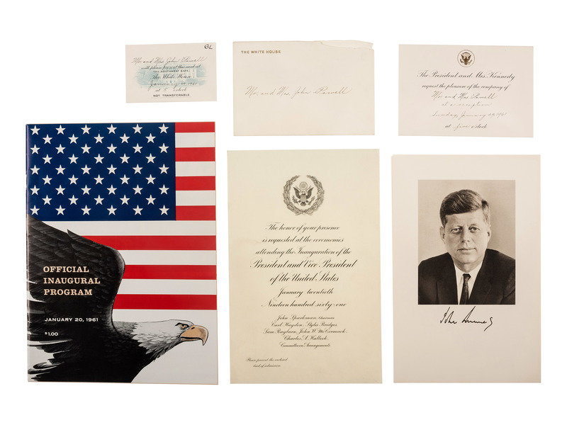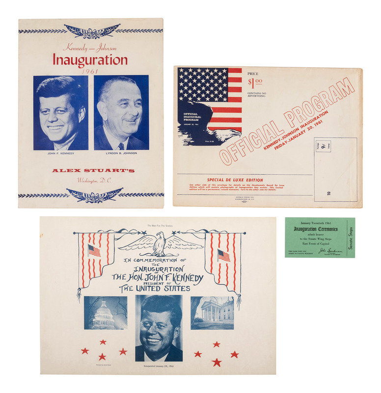 [With:] A green ticket, No. 1238, admitting bearer to the "Senate Wing Steps / East Front of Capitol" for the Kennedy/Johnson inauguration day. -- An "Official Inaugural Program," January 20, 1961, 8 1/4 x 11 1/4 in. -- Menu for the "Inaugural Dinner 1961," 9 1/4 x 12 in. -- Commemorative inauguration poster designed by Jacob Chuck, approx. 15 x 10 in., recognizing Kennedy as "The Man for the Sixties."