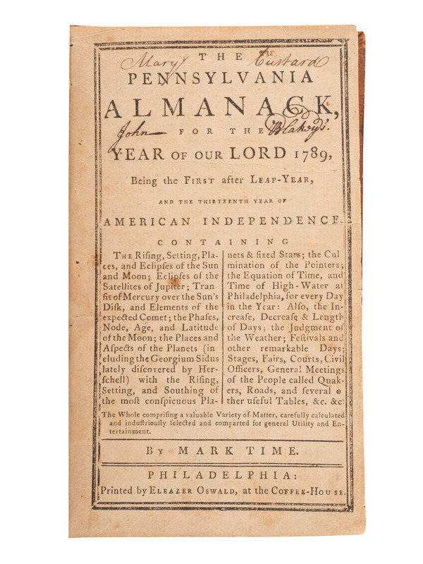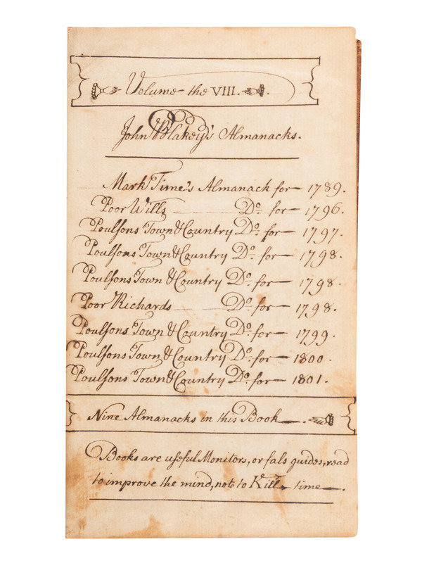 TIME, Mark, pseudo. The Pennsylvania Almanack, for the Year of Our Lord 1789. Philadelphia: Eleazer Oswald, [1789]. -- [WARING, William]. Poor Will's Almanack for the Year of Our Lord, 1796. Philadelphia: Joseph Crukshank, [1795]. -- SHOEMAKER, Abraham. Poulson's Town and Country Almanac, For the Year of Our Lord, 1796. Philadelphia; Zachariah Poulson, Junior, [1795]. -- SHOEMAKER, Abraham. Poulson's Town and Country Almanac, For the Year of Our Lord, 1797. Philadelphia; Zachariah Poulson, [1796]. -- SHOEMAKER, Abraham. Poulson's Town and country Almanac, For the Year of Our Lord, 1798. Philadelphia; Zachariah Poulson, [1797]. -- SAUNDERS, Richard. Poor Richard Improved: Being an Almanack...For the Year of our Lord 1798. Philadelphia: Hall & Sellers, [1797]. -- SHOEMAKER, Abraham. Poulson's Town and Country Almanac, for the Year of our Lord, 1799. Philadelphia: Zachariah Poulson, [1798]. -- SHOEMAKER, Abraham. Poulson's Town and Country Almanac, for the Year of our Lord, 1800. Philadelphia: Zachariah Poulson, [1799]. -- SHOEMAKER, Abraham. Poulson's Town and Country Almanac, for the Year of our Lord, 1801. Philadelphia: Zachariah Poulson, [1800].