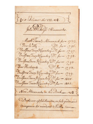 [ALMANACS]. A sammelband of 18th century American almanacs, including The Pennsylvania Alamanack, Poor Will's Almanack, Poulson's Town and Country Almanac, and Poor Richard Improved. 1789-1800.