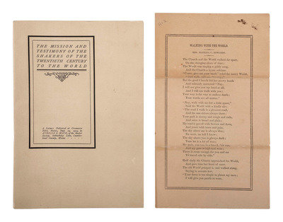 [With:] MACE, Aurelia G. The Mission and Testimony of the Shakers of the Twentieth Century to the World. [Maine?]: N.p., [1904?]. 8vo. Photographic frontispiece. Original wrappers (minor toning). RARE: OCLC locates 10 copies.