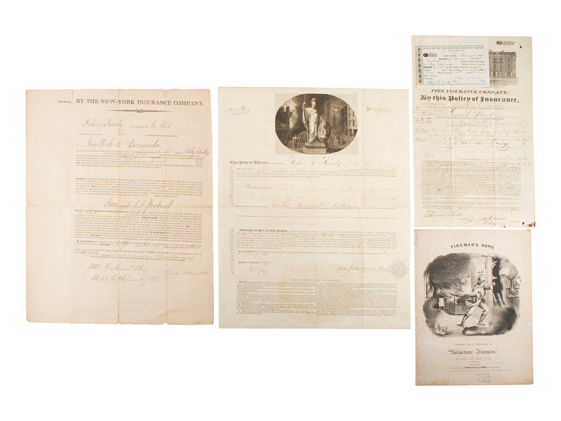 Partially printed insurance policy, for the Chatham Ins. Co., 10 x 16”, nice graphic of town at the top, small building burning in the near background. Insurance policy for freight on a Schooner called the Polly & Sally. 15-1/2 x 19-1/2”