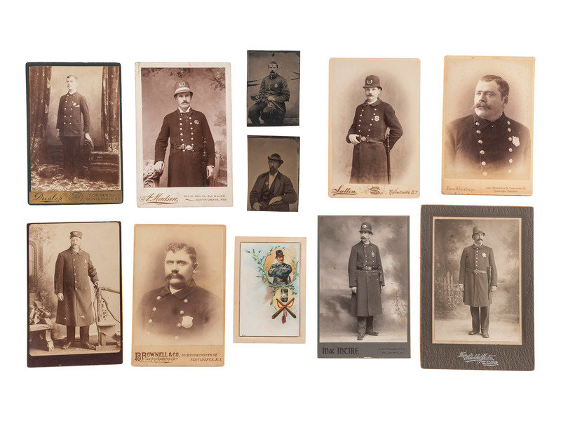 Eight cabinet cards appear to be policemen. Some hold truncheons, a couple have “POLICE” badges, a couple of other badges have stars in the center and another badge is a six-pointed star.