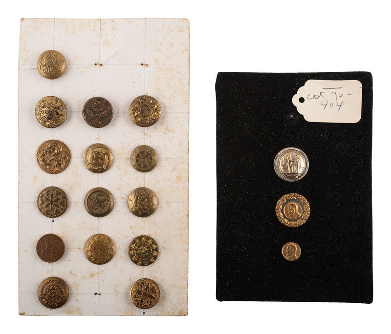 18 buttons, all different. One is a small officer’s uniform button with eagle and shield, 3/4“ diam. One has a modified seal of the commonwealth of Kentucky, with two men shaking hands. But the button has “United we Stand; Divided we Fall” around the edge of the button rather than on a ribbon below the men (as the seal does). Two other somewhat unique buttons both have Abraham Lincoln’s profile; one has a wreath around him, the other has none. Most of the others have either plants or geometric designs, but none clearly fire or police.