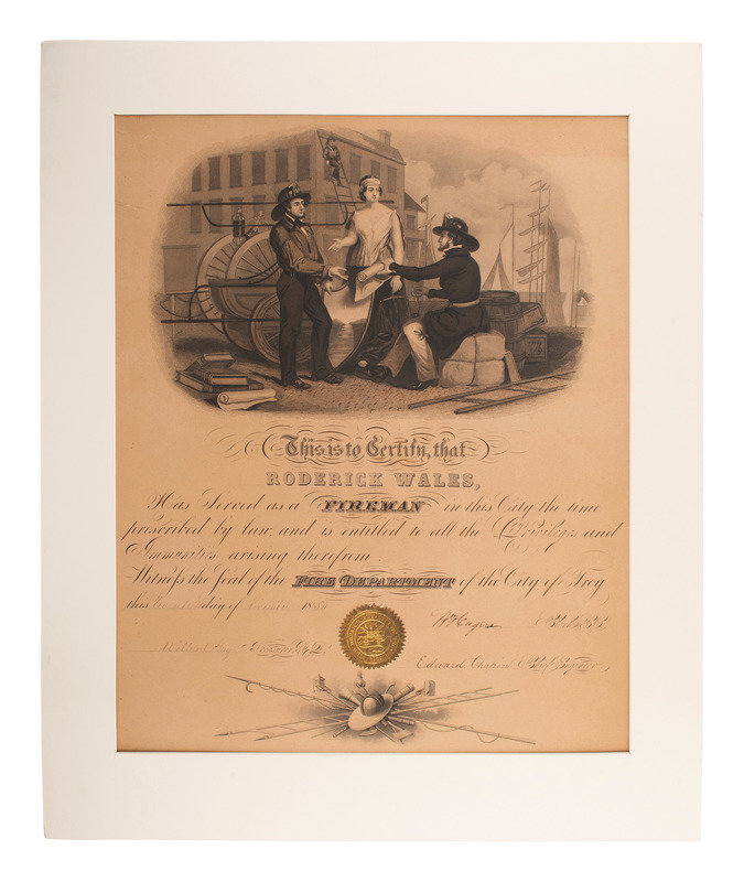 Certificate stating that Roderick Wales had served as a fireman and is entitled to all the privileges arising therefrom. 20 Nov. 1850, City of Troy, (state?) Matted, 14 x 17-1/2” (sight). Lovely graphic at top of fireman handing a certificate (?) to another as a woman (“Columbia?) looks on. (moderate browning, esp. at top.)