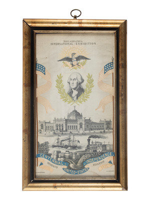 Large Centennial Exhibition stevengraph silk souvenir ribbon with multi-colored embroiderery featuring an image of George Washington at center beneath set of laurel leaves. On either side of George Washington are thirteen-star banners, with "Philadelphia / International - Exhibition" and the patriotic eagle and shield above his illustration. Just below Washington is Memorial Hall which housed the art exhibits of the Centennial. The bottom of the silk shows a modern factory, a steamship, a railroad and agricultural products representing the growing commercial strength of America and simultaneously representative of the city of Philadelphia. A flowing riband made of blue and gold thread and featuring the text "Centennial - United States - Independence" / "1776 - 1876" encompasses the bottom of the stevengraph. Small text on the bottom right and left of the piece identifies the names of the designer "J.B. Champromy" and printer "A. Larcher PA." Approx. 6 x 10 ¾ in. (sight), framed to 7 ½ by 12 ¼ in. (silk in good overall condition with some light soil, faint damp stain on the bottom, red thread in flag and on riband faded, frame with wear and some loss of its gilt paint). Wood frame may be original as stevengraphs were sold as souvenirs at the 1876 exhibition both with and without the frame.